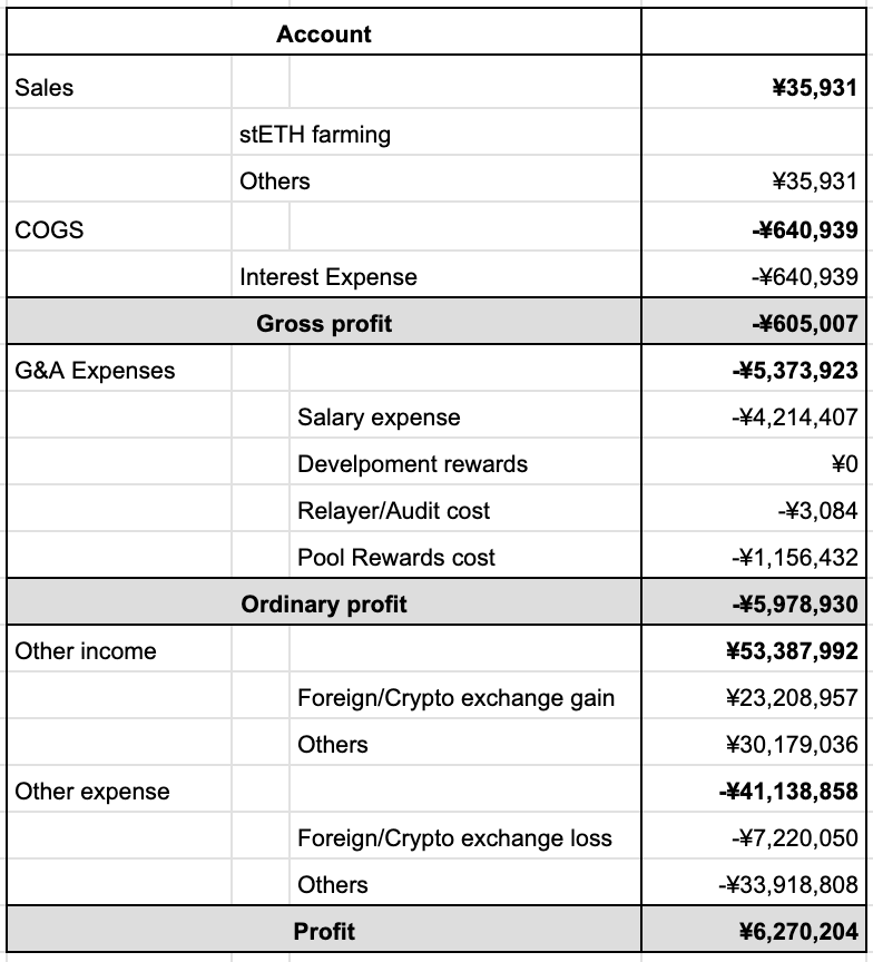 ・Other expenses (Others) consists mostly of LPs ETH decrease and ETH decrase due to TXJP buy&pool (both excluding fx gain/loss)