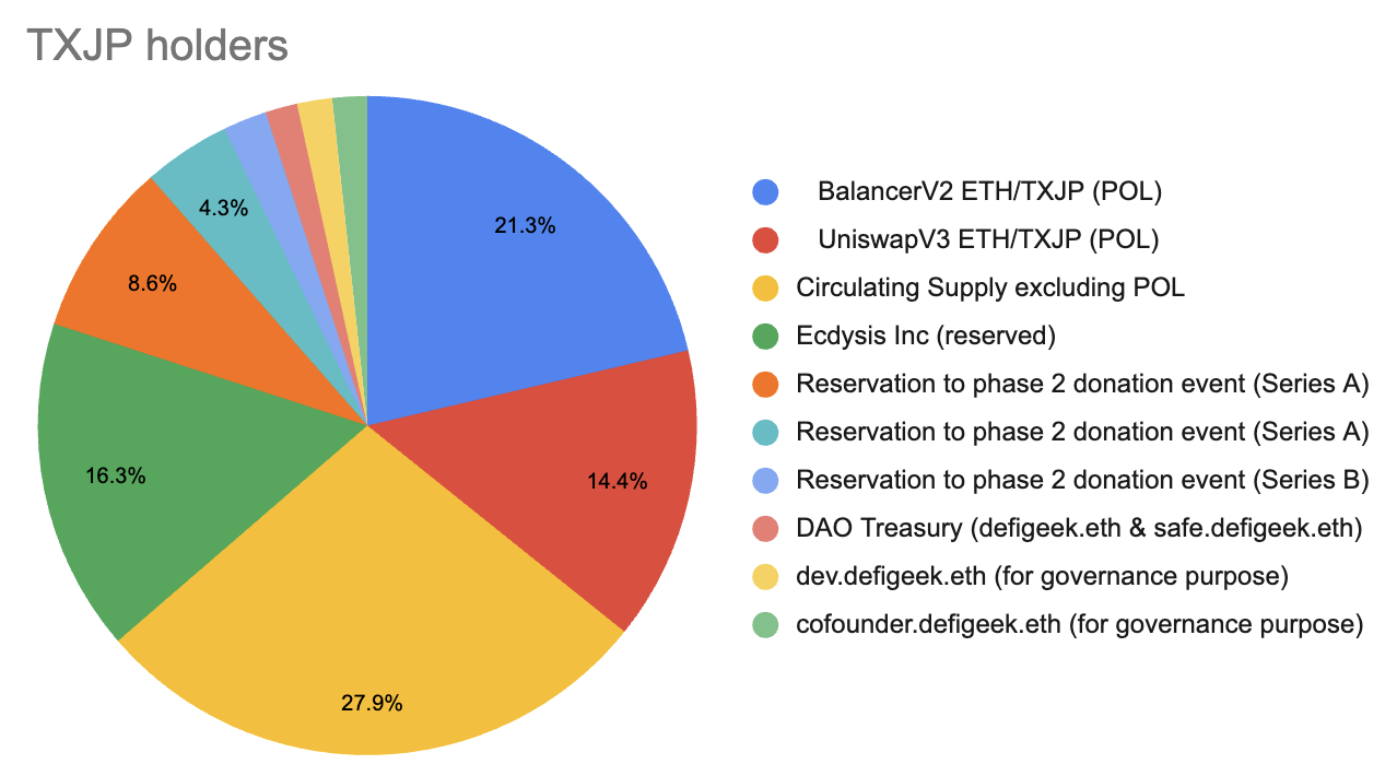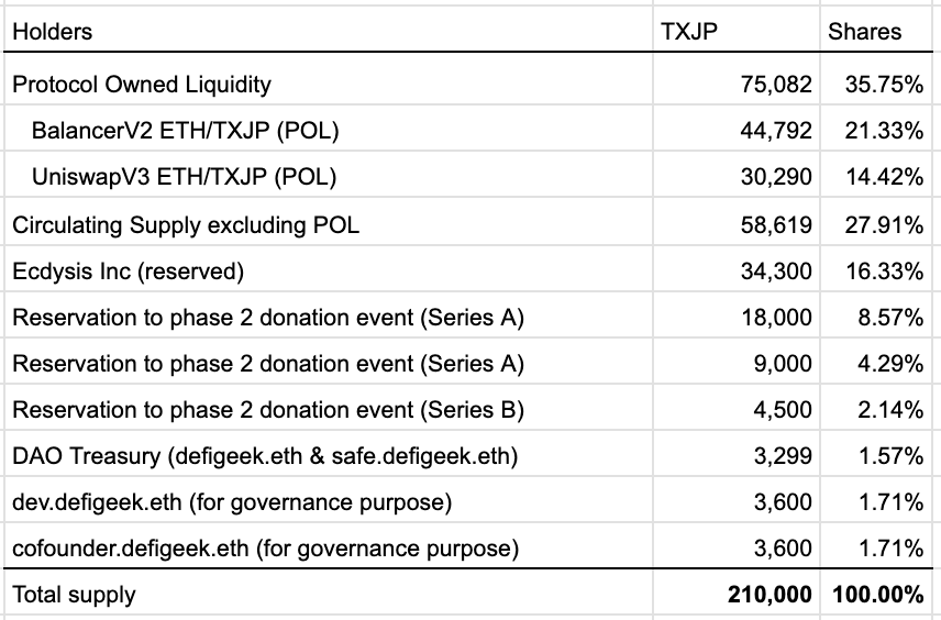 ・Allotment for future prospective Series A, B and C (total 31,500 TXJP) have issued and been held at Multisig Safe (safe.defigeek.eth).